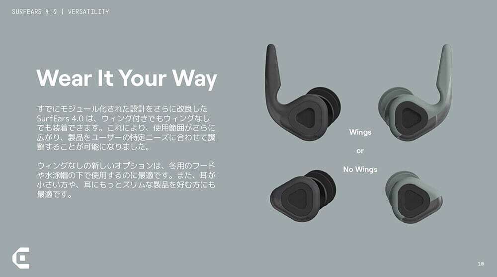 特別に開発された独自の音響メッシュを利用して聴覚に影響を与えることなく、水・冷気・汚れ・バクテリアから耳を守り、サーファーズイヤー(外耳道骨腫)になりにくくする世界で唯一の耳栓です。